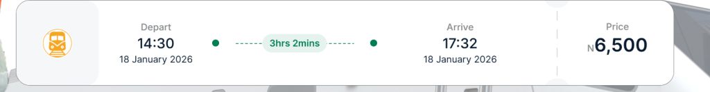 - ₦3,600 to ₦9,000 (depending on class, seat type, and availability)