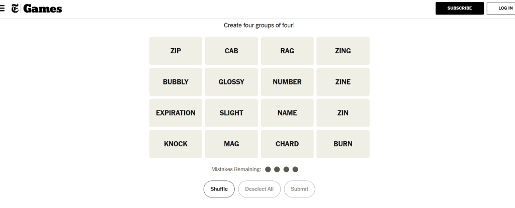 Start with the Grid: You’ll be presented with a 4×4 grid of 16 words. Your task is to group them into four sets of four related words.