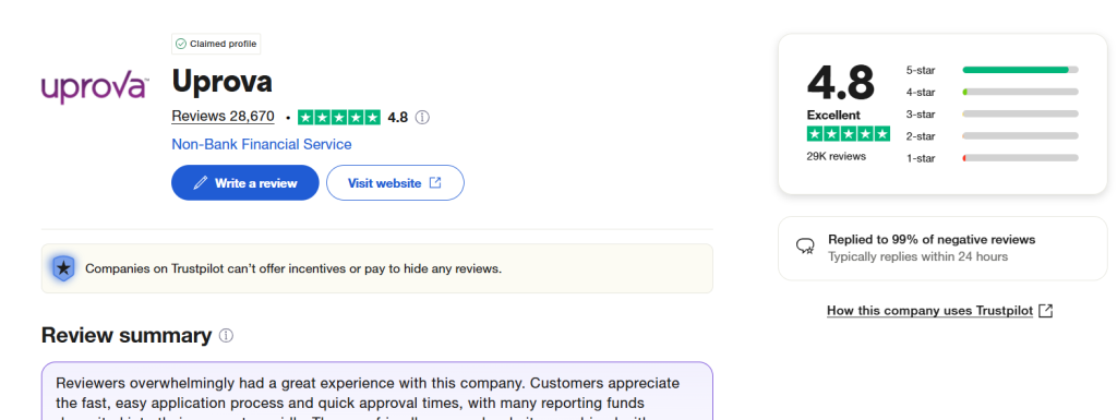Customer satisfaction has been a driving force behind Uprova’s growth. On platforms such as Trustpilot and Better Business Bureau (BBB), Uprova maintains a solid rating, with many users praising the speed of approval, user-friendly interface, and transparent communication.